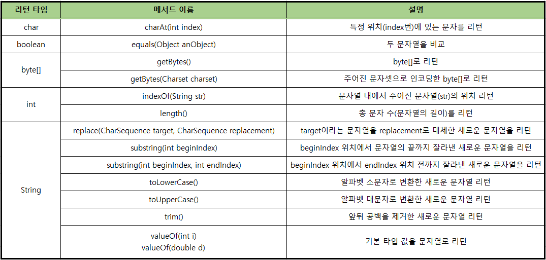 - String 클래스는 문자열의 추출, 비교, 찾기, 분리, 변환 등과 같은 다양한 메서드를 가지고있다.