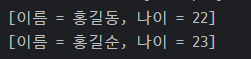 return "[이름 = " + 이름 + ", 나이 = " + 나이 + "]";
