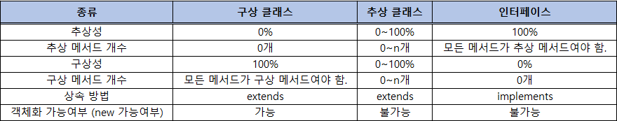 - 다음은 표를 통해 구상(일반) 클래스, 추상 클래스, 인터페이스를 비교해보자