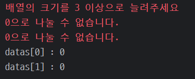 - 여기서 에러 출력문이 2번 출력되는 이유는 배열에 있는 모든 숫자를 0으로 나누려해서 2번 예외처리한 것이다.