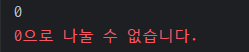 - 여기서는 try에서 특정 숫자를 0으로 나눠서 예외 상황이 발생했으니 catch로 넘어가서 에러 출력문을 출력하고 결과 값을 0으로 저장한다.
