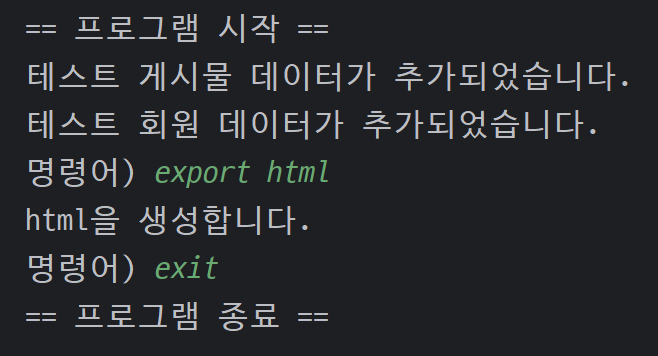 - 프로그램 실행과 동시에 사용자가 "export html"을 입력하게 되면, html 포맷에 맞춰 현재 article list에 담긴 번호, 날짜, 작성자, 제목, 내용을 웹 화면에 표출하도록 html 파일을 생성하는 것이다.