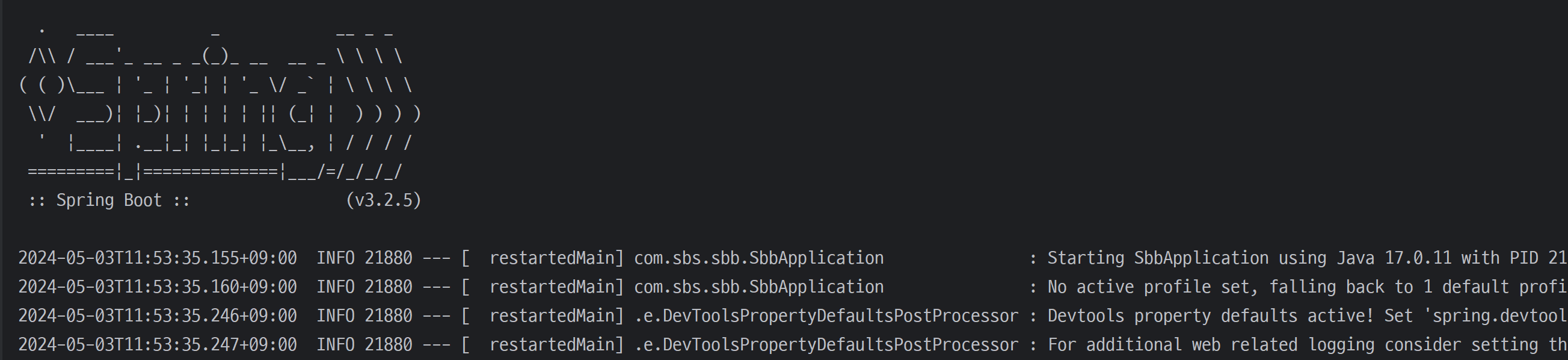 - DB가 계속 연결되어 있다는 가정 하에 이제 프로젝트를 실행하게 되면 아래 그림처럼 콘솔창에 Spring 화면이 나오게되고, 웹 브라우저를 통해 로컬 웹 서버에 접속할 수 있게된다.