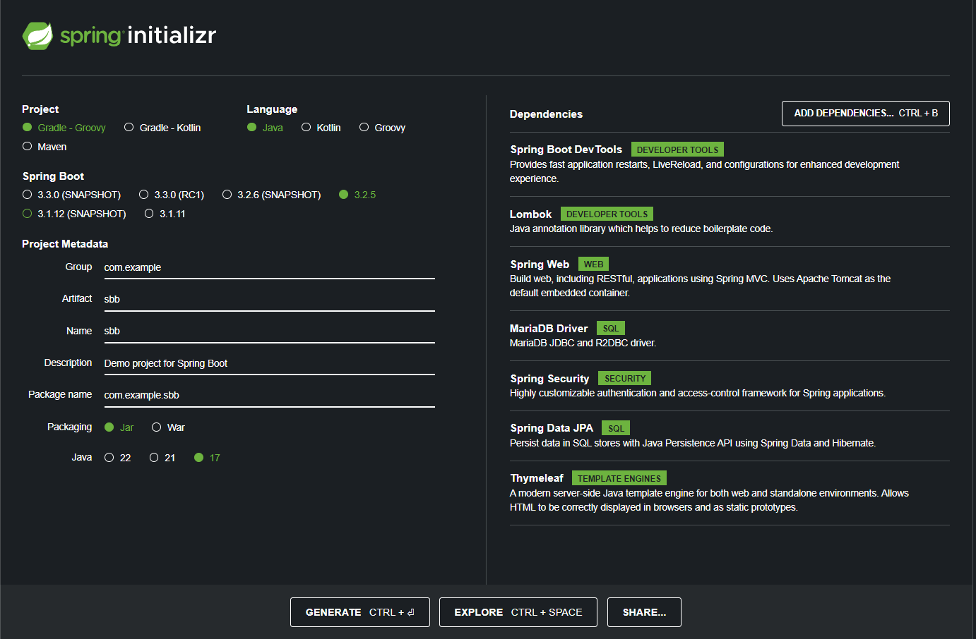 - lombok은 Getter와 Setter를 활용하기 위한 라이브러리이고, MariaDB Driver는 DB를 사용하기 위한 드라이버이다.