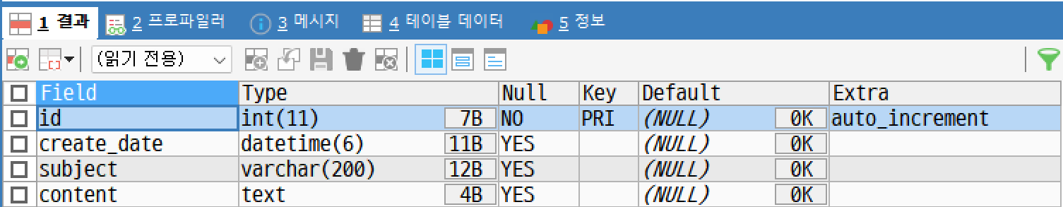 - 아래는 실제로 Question.java 엔티티를 통해 question 테이블이 생성된 모습이다.