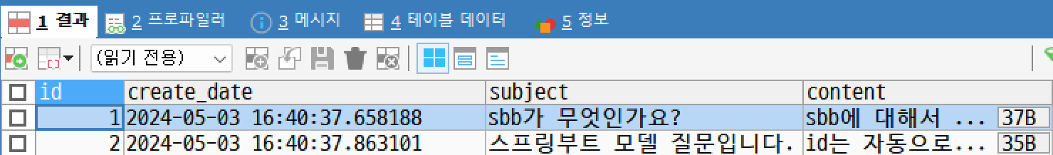 - 작성한 SbbApplicationTests.java 클래스를 실행해보면 아래와 같이 실제로 DB에 새로운 데이터들이 추가되고 저장된 모습을 볼 수 있다.
