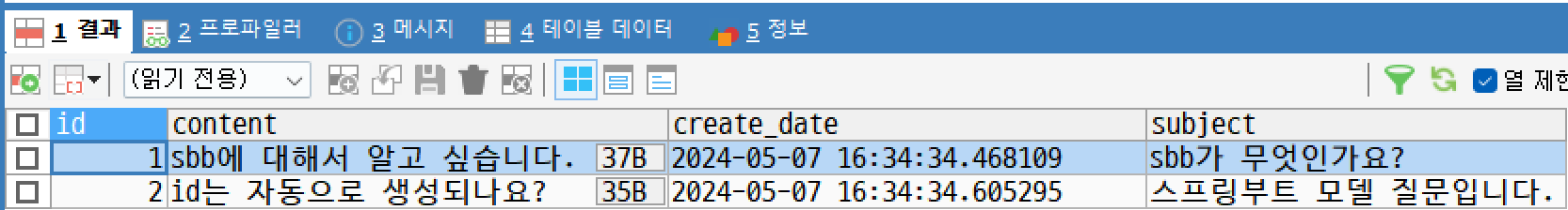 - findBySubject("sbb가 무엇인가요?") 메서드는 DB 쿼리로 생각했을 때 "SELECT * FROM question WHERE subject = 'sbb가 무엇인가요?'" 와 의미가 같다.