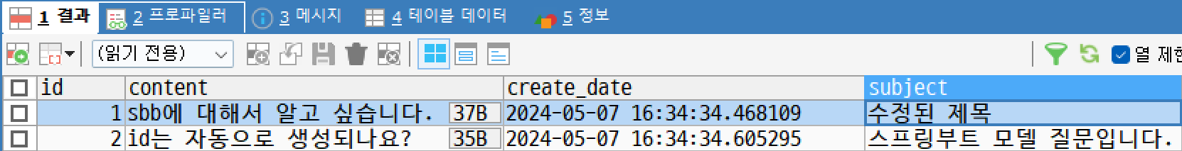 - q.setSubject("수정된 제목") 을 통해 해당 데이터의 subject 값을 '수정된 제목' 으로 수정한다.