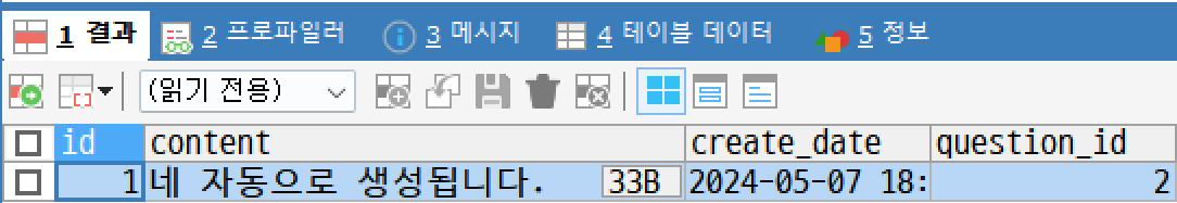 - 아래 사진은 실제로 DB에서 조회한 결과, answer 데이터가 새로 추가된 모습을 볼 수 있다.