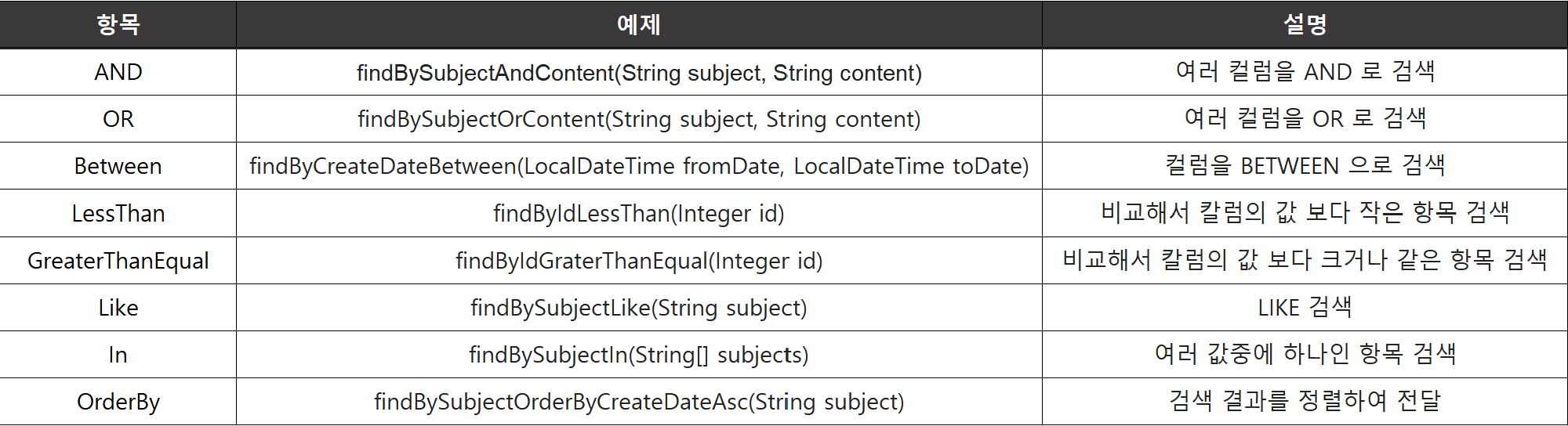 - findBySubject나 findBySubjectAndContent와 같은 메서드 외에도 수많은 조합을 사용할 수 있다.