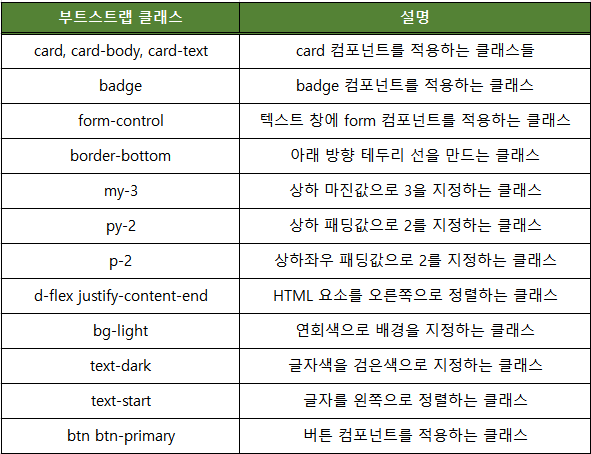 - 아래 표는 참고용으로 부트스트랩 클래스에 대한 몇 가지 설명을 담았다.