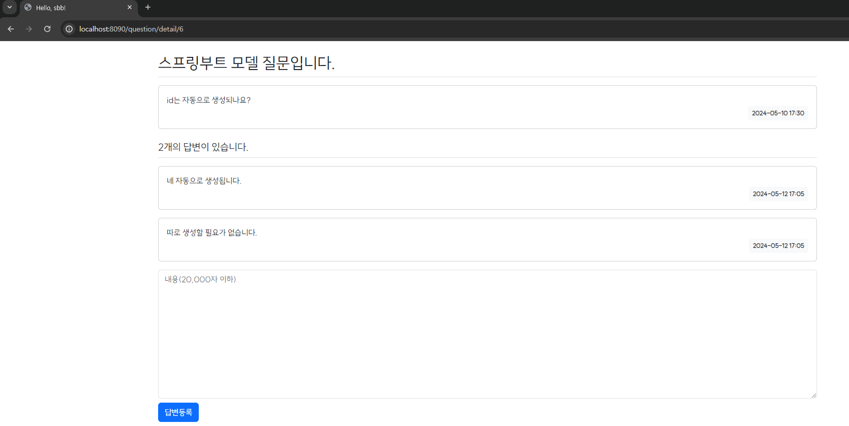- 아래는 부트스트랩 적용 후 변경된 localhost:8090/question/detail/2의 화면 디자인이다.