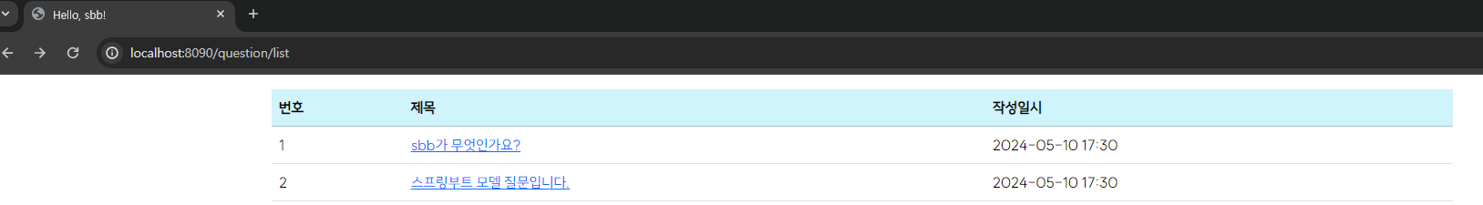 - 아래는 부트스트랩 적용 후 변경된 localhost:8090/question/list 의 화면 디자인이다.