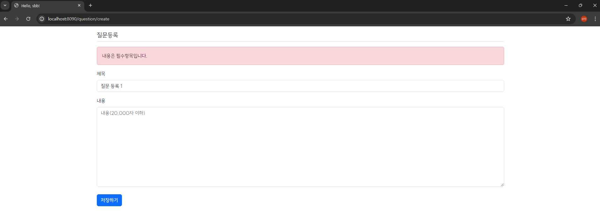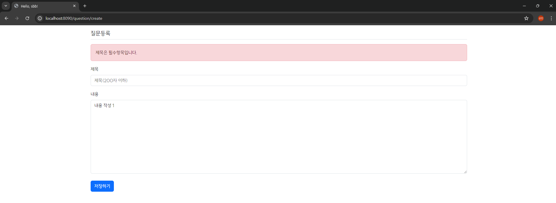 - 따라서 questionCreate() 메서드는 bindingResult.hasErrors() 메서드를 조건문을 통해 호출하여 에러가 있는 경우 다시 입력을 하도록하고 에러가 없을 때 질문이 저장되도록 하였다.