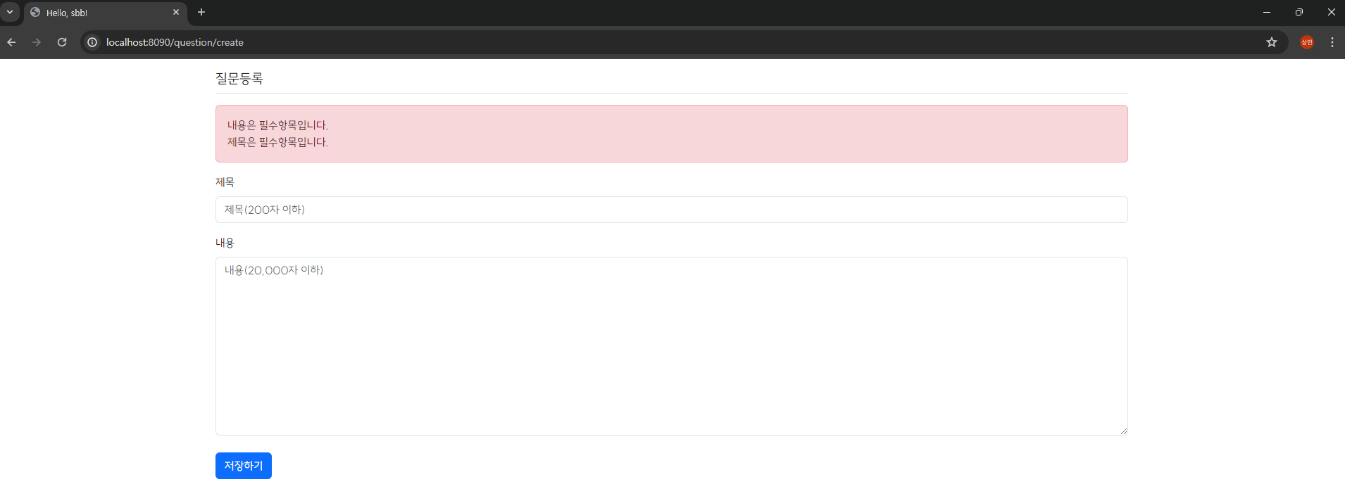 - 여기까지 구현이 완료됐다면 아래 사진과 같이 질문 작성 시 제목 또는 내용 또는 둘 다 입력을 하지 않았을 때 에러 메시지가 화면에 표시되는 것을 볼 수 있다.