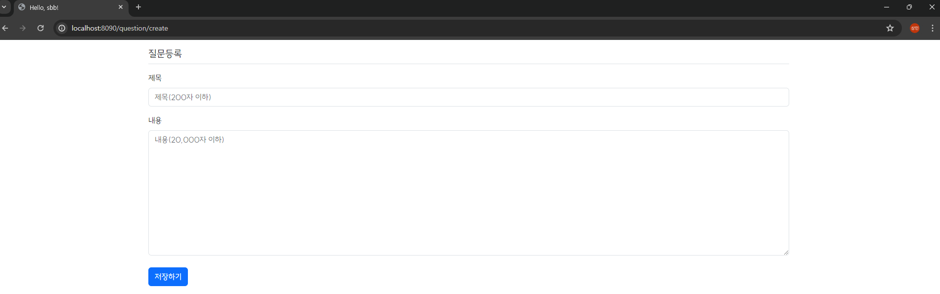 - 입력한 내용을 '저장하기' 버튼을 통해 submit하게 되면 해당 폼이 /question/create로 POST 방식을 이용해 전송하도록 하였다.