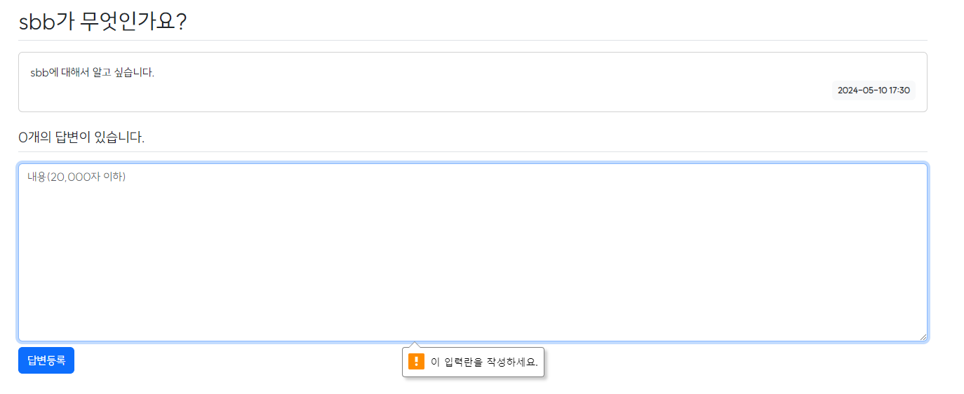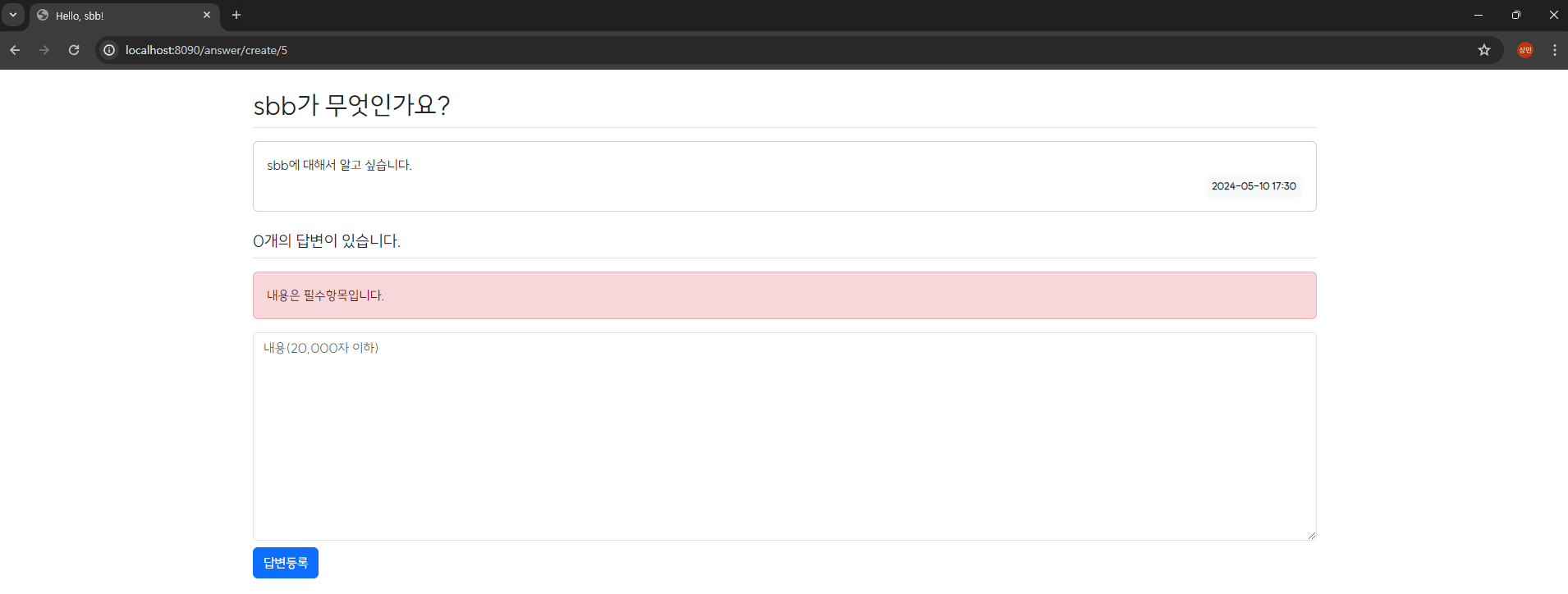 - 위의 나열된 모든 코드들을 각 클래스에 작성하고 로컬 서버를 다시 실행해보면 답변 등록 시에도 폼 클래스를 이용한 유효성 체크가 적용되었을 것이다.