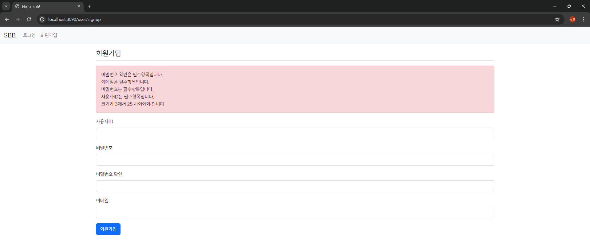 - username은 @Size 어노테이션을 통해 입력받는 데이터의 길이가 3 ~ 25자 사이여야 한다는 검증 조건을 설정하였다.