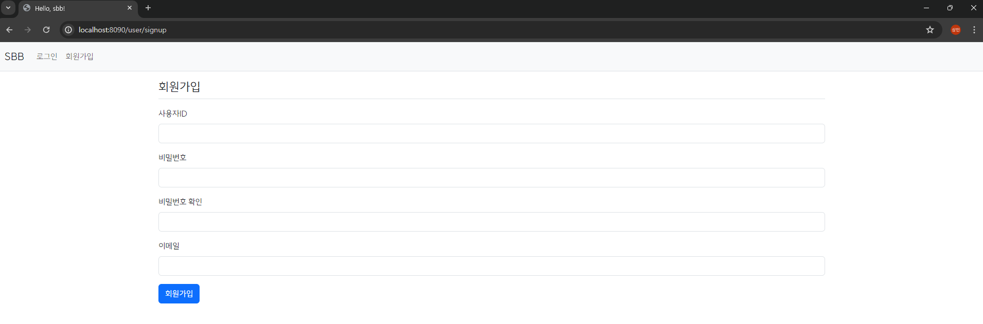 - ID, 비밀번호, 비밀번호 확인, 이메일에 해당하는 input 요소들을 추가하여 회원가입 화면에 각각의 필드가 나타나도록 하고, '회원가입' 버튼을 클릭하게 되면 form 데이터가 POST 방식으로 /user/signup URL에 전송된다.