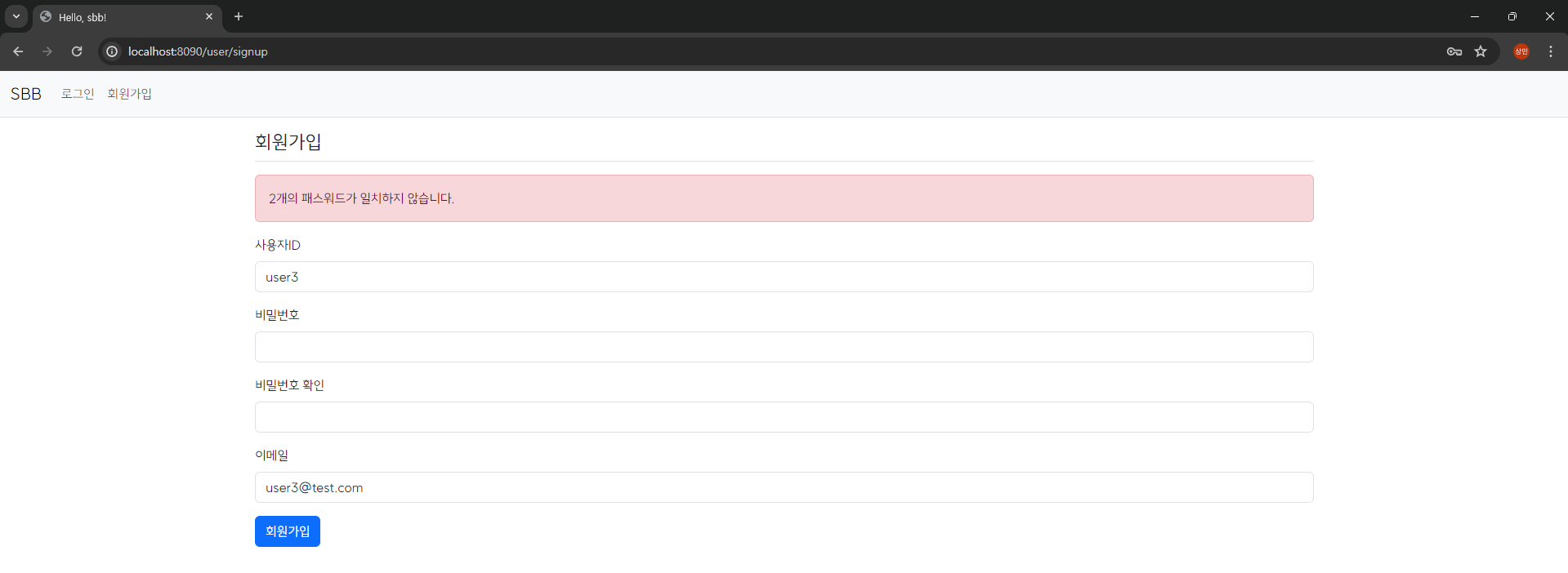 - 만약 2개의 값이 서로 일치하지 않을 경우에는 bindingResult.rejectValue()를 사용하여 입력받은 2개의 비밀번호가 일치하지 않다는 에러가 발생하도록 하였다.
