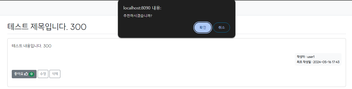 - 추가로 onclick="return confirm('추천하시겠습니까?')" 를 속성에 추가하여 '좋아요' 버튼을 클릭했을 때 한 번 더 확인할 수 있도록 alert 알림창이 나오도록 하였다.