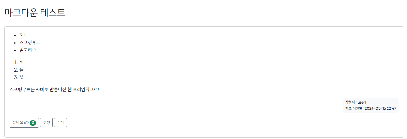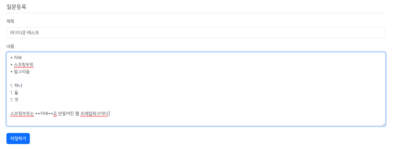 - 위 코드를 모두 작성하고 로컬 서버를 다시 실행하면 질문이나 답변의 내용을 입력할 때 마크다운 형식의 문법을 통해서 작성하면 해당 문법이 변환되어 HTML에 표시되는 것을 확인할 수 있다.