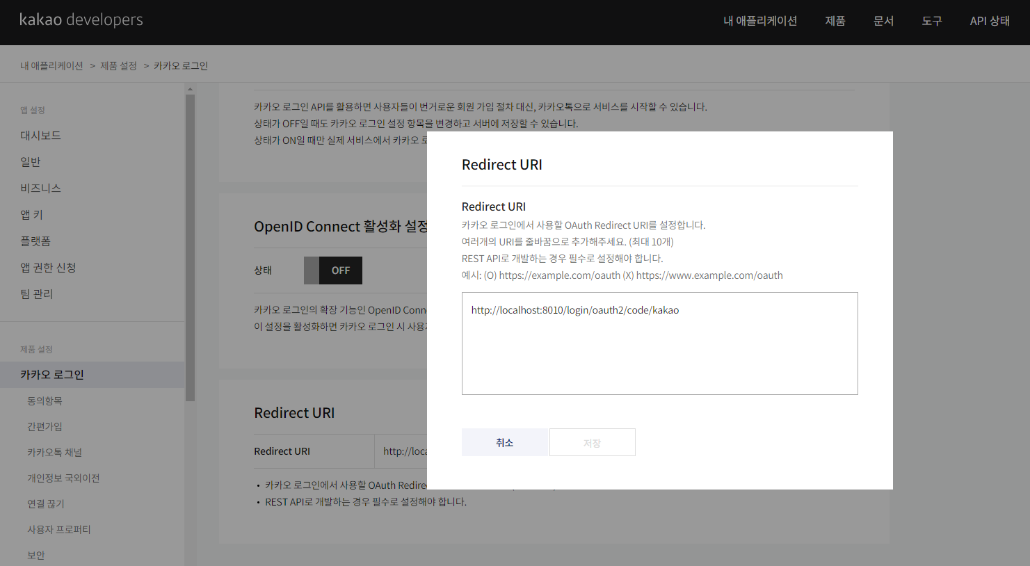 - 여기까지 완료됐다면 다시 카카오 디벨로퍼에 접속하여 '카카오 로그인' 메뉴를 선택한 후 하단의 'Redirect URI' 항목에 application.yml에서 작성한 redirect-uri 주소를 동일하게 입력해야 한다.