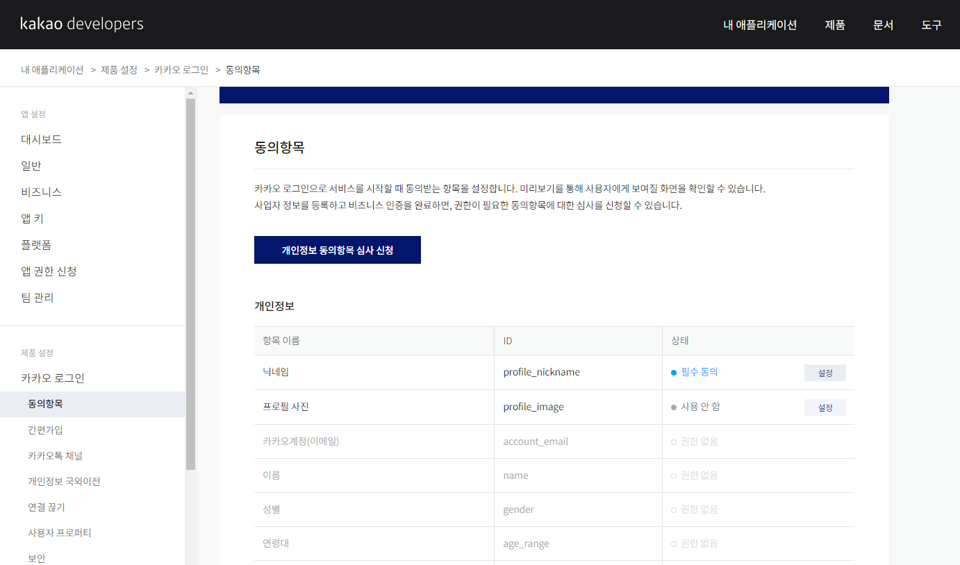 - 활성화를 해줬으면 좌측 메뉴에서 '동의항목' 메뉴를 클릭하고 개인정보에서 닉네임과 프로필 사진의 상태를 '필수 동의' 상태로 변경해준다.