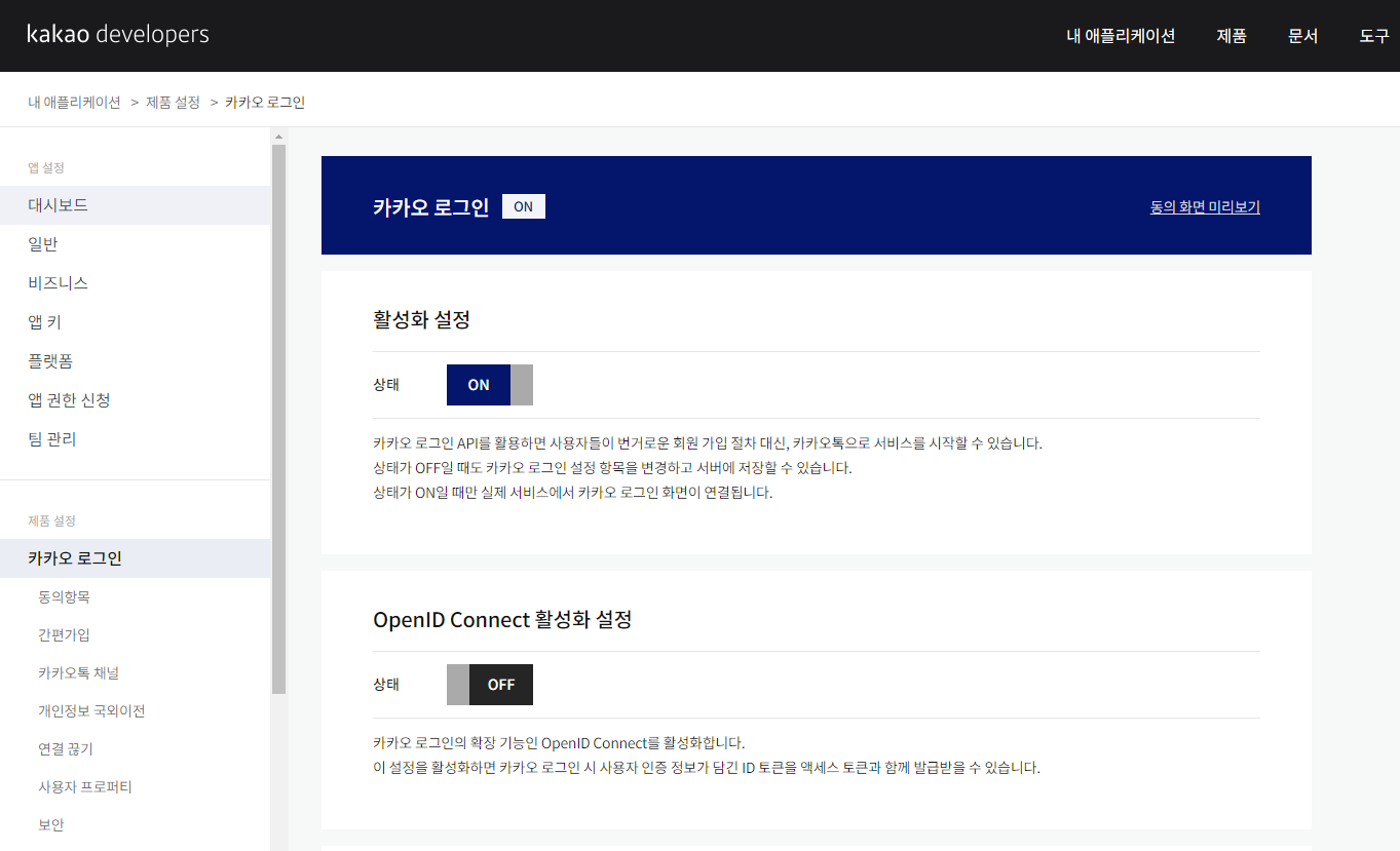 - 좌측에 나열된 메뉴 중 제품 설정의 '카카오 로그인' 메뉴를 클릭하고 활성화 설정에서 상태를 ON으로 변경해준다.
