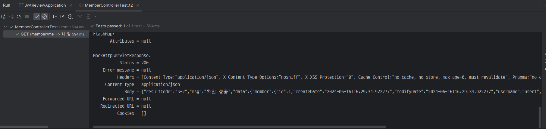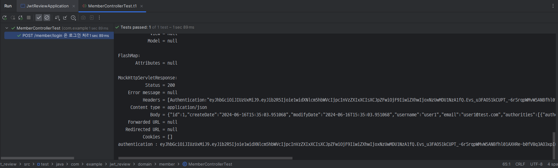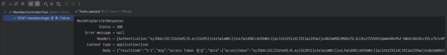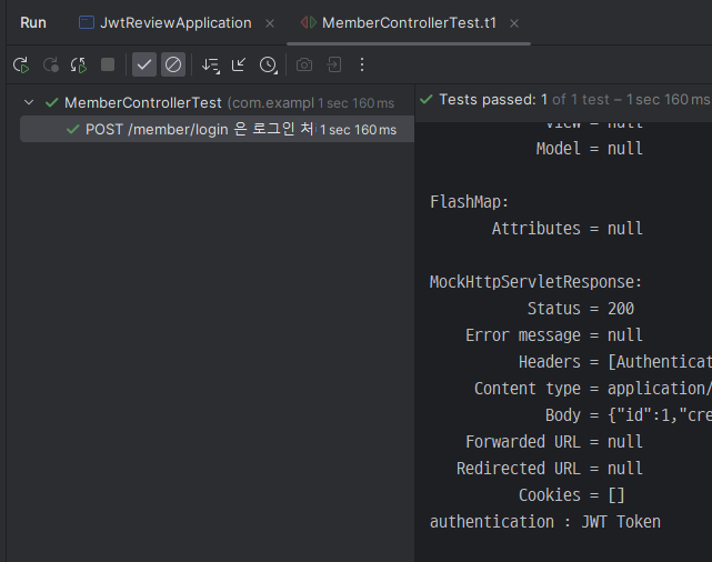 - 그 다음은 테스트 MemberController.java 클래스에서 아래와 같이 코드를 작성하면 위에서 실제 MemberController.java의 login() 메서드에서 addHeader()로 헤더에 추가한 "Authentication"을 테스트에서 가져와서 "JWT Token" 이라는 문자열이 출력되는 것을 확인할 수 있다.