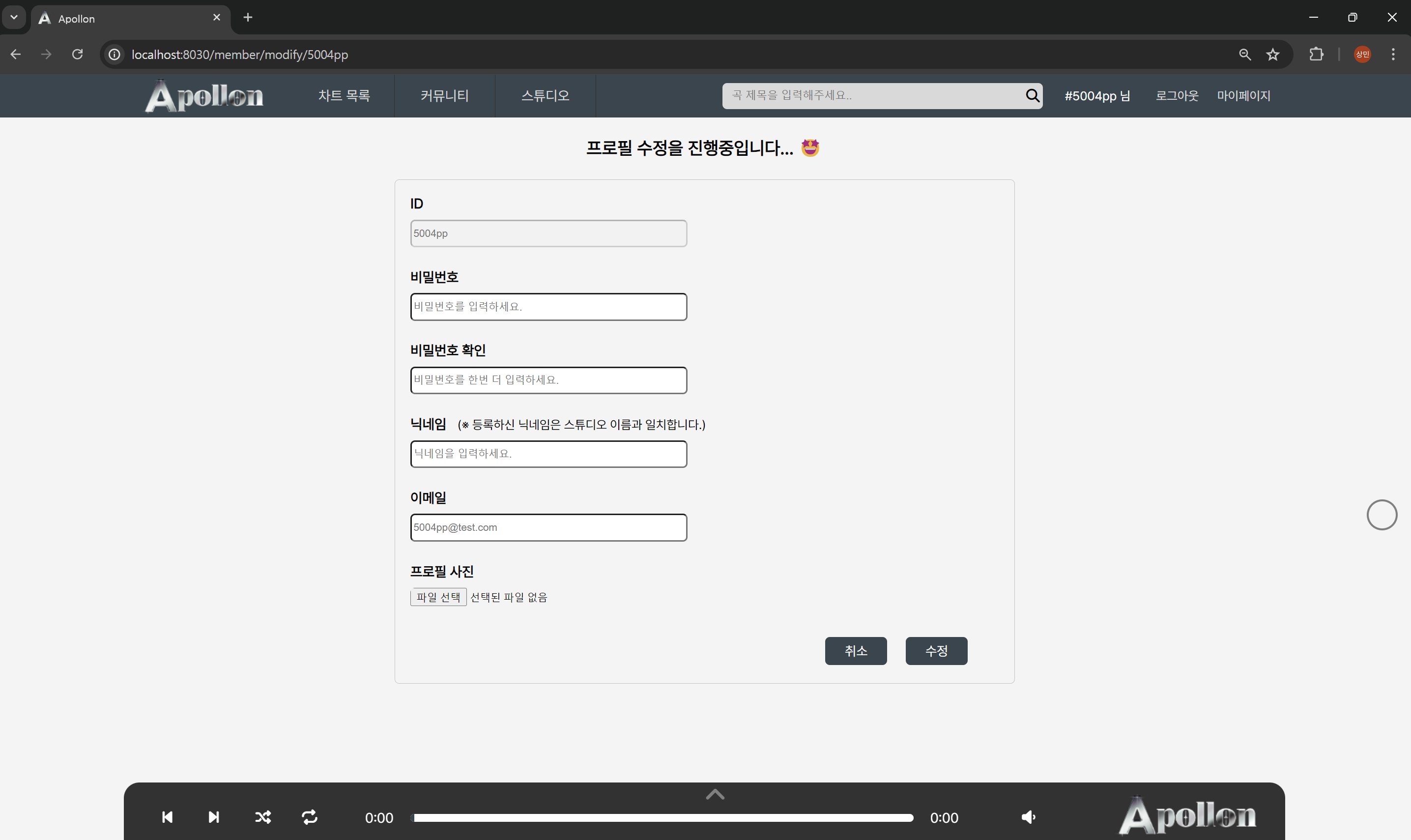 - 검색창을 통해 현재 Apollon 서비스에 등록된 모든 음악에 대해 제목을 기준으로 검색이 가능합니다.