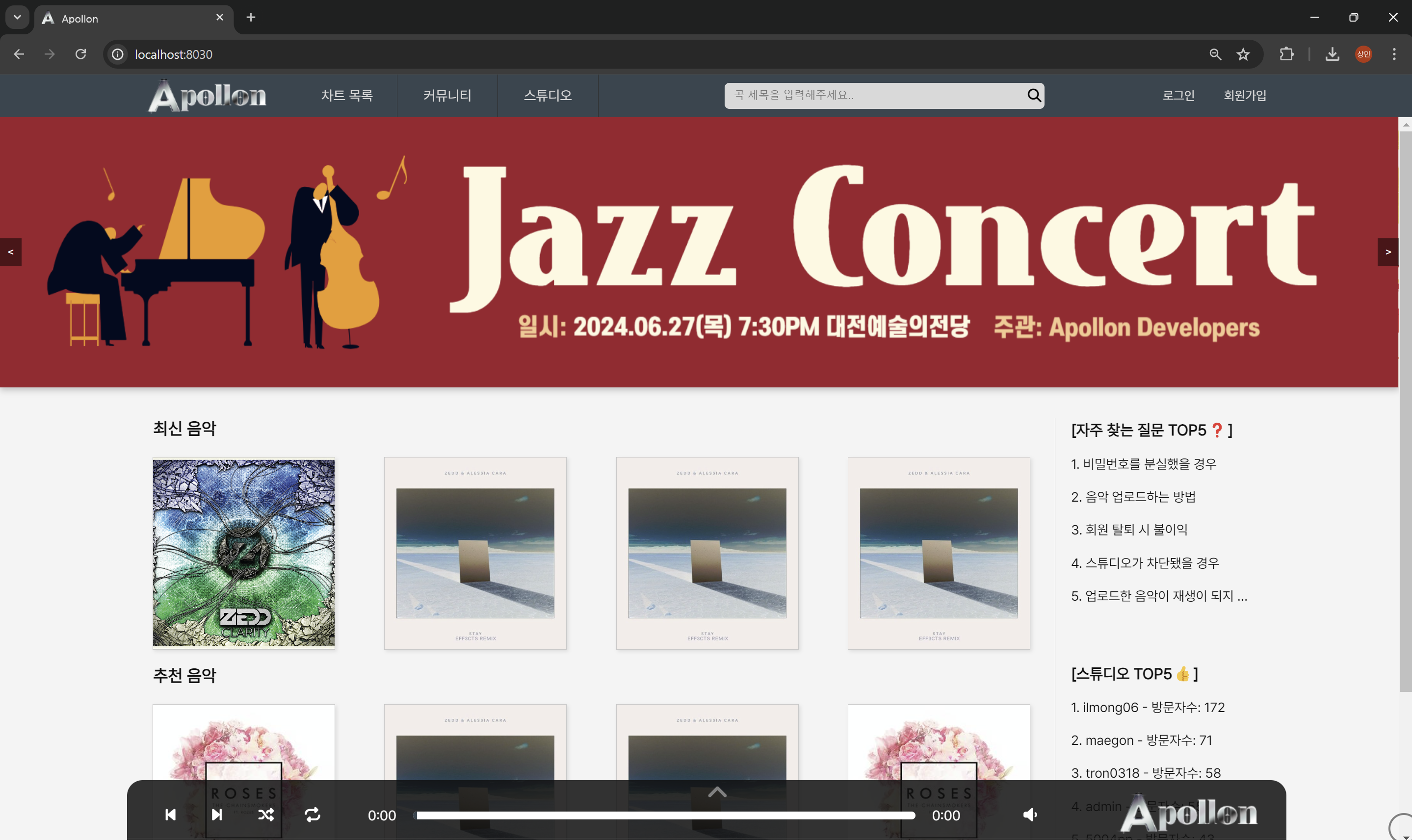 - 스튜디오 TOP5의 경우 Apollon 서비스의 등록된 모든 회원의 스튜디오 중 방문자 수가 가장 많은 순서로 나열됩니다. 만일 방문자 수가 동일하다면 동일한 스튜디오는 랜덤으로 나열되도록 하였습니다.