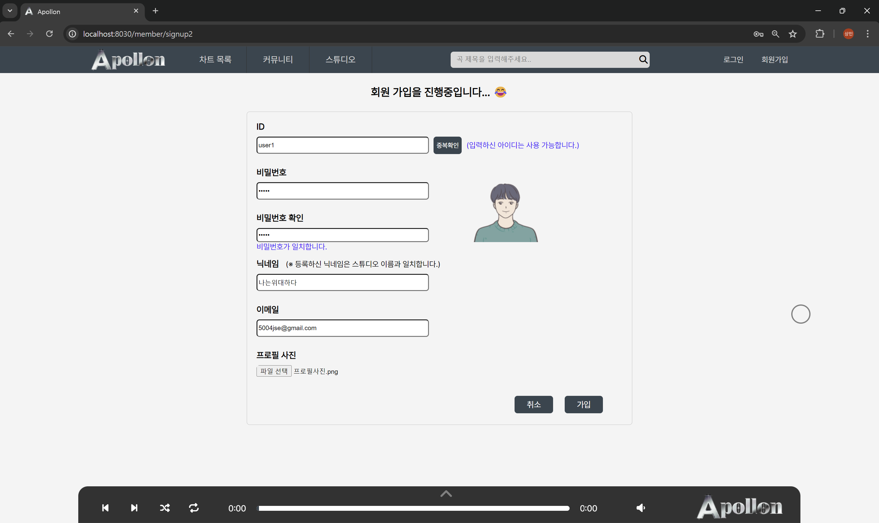- 프로필 사진을 파일 내에서 선택하면 회원가입 폼 우측에 선택한 이미지 파일을 미리볼 수 있습니다.