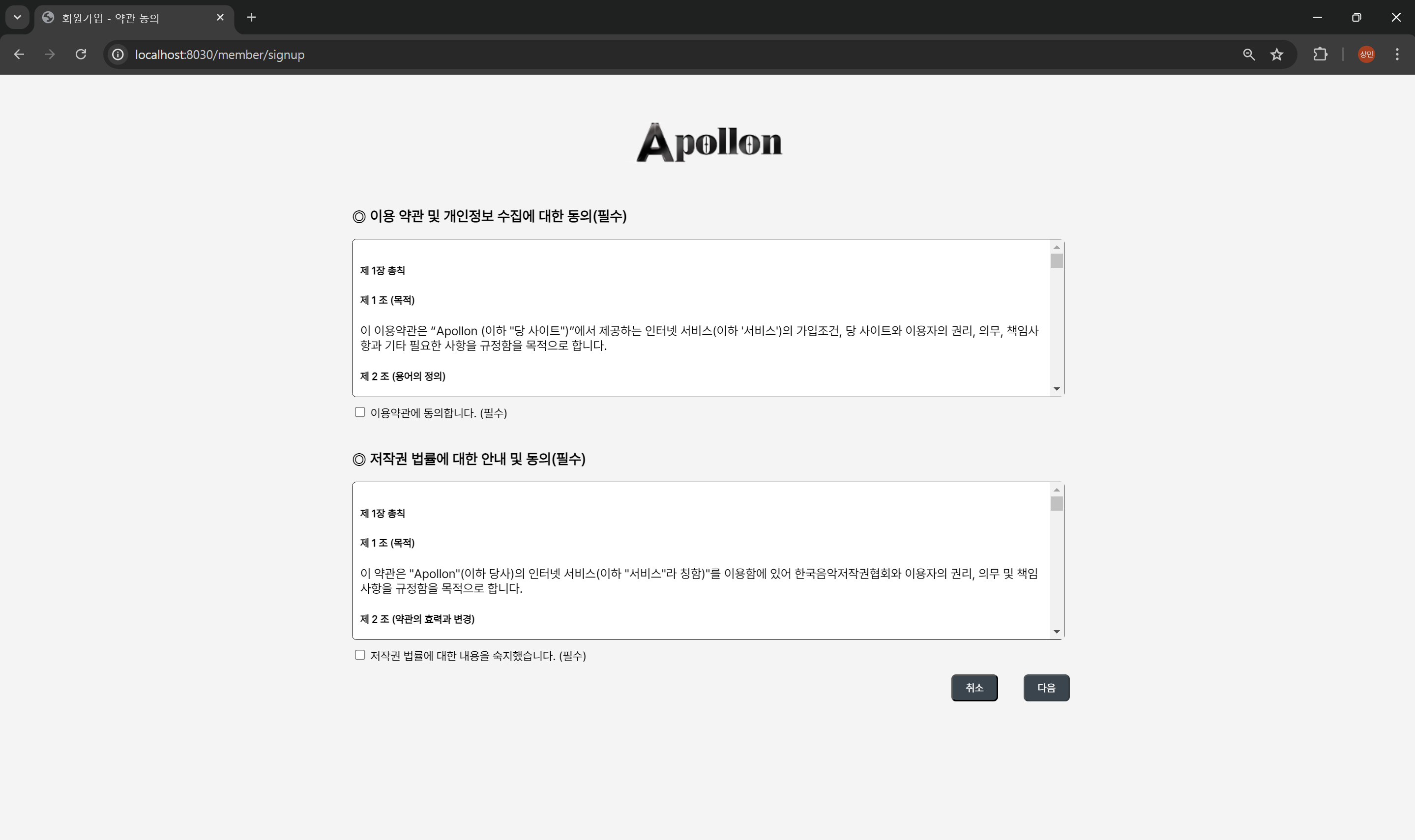 - 상단 헤더의 회원가입 메뉴 클릭과 동시에 이용약관 및 개인정보 수집과 저작권 안내에 대한 동의서 제출이 요구됩니다.