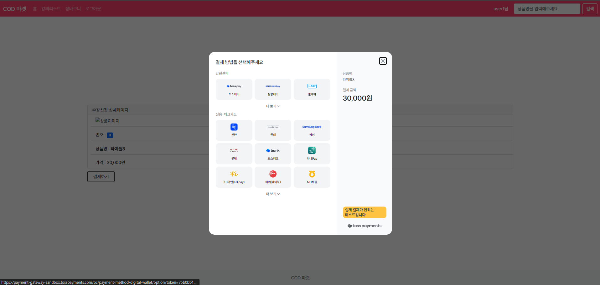 - 위처럼 프론트엔드와 백엔드 모두 코드를 적용하여 프로젝트에 맞게 수정하면 아래와 같이 결제 시스템이 연동되는 것을 확인할 수 있다.