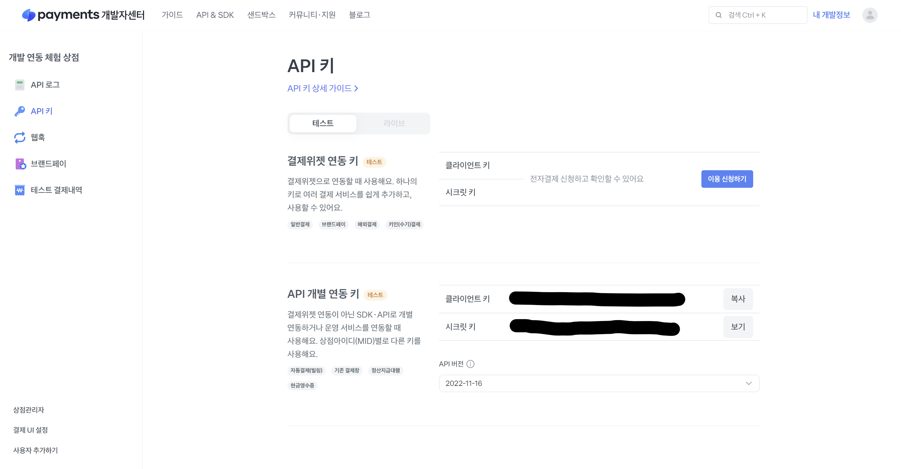 - Script를 보면 tossPayments 변수에 테스트 클라이언트 키를 넣어야 하는데, 이 키는 토스페이먼트 홈페이지에서 확인한 클라이언트 키를 넣어주면 된다.