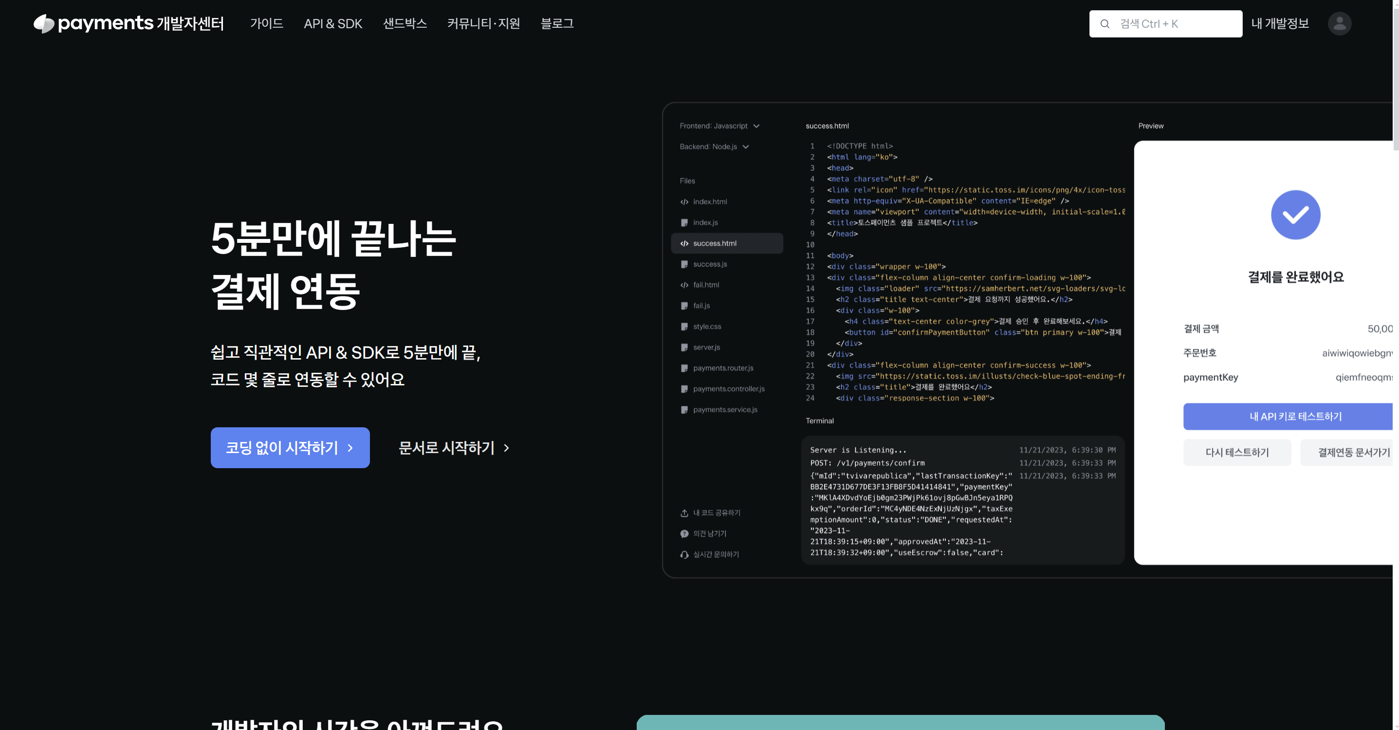 - 토스페이먼츠에서 제공하는 결제 연동 코드 샘플을 가져와서 결제에 필요한 템플릿에 해당 코드를 적용하고 상황에 맞춰 코드를 수정해야한다.