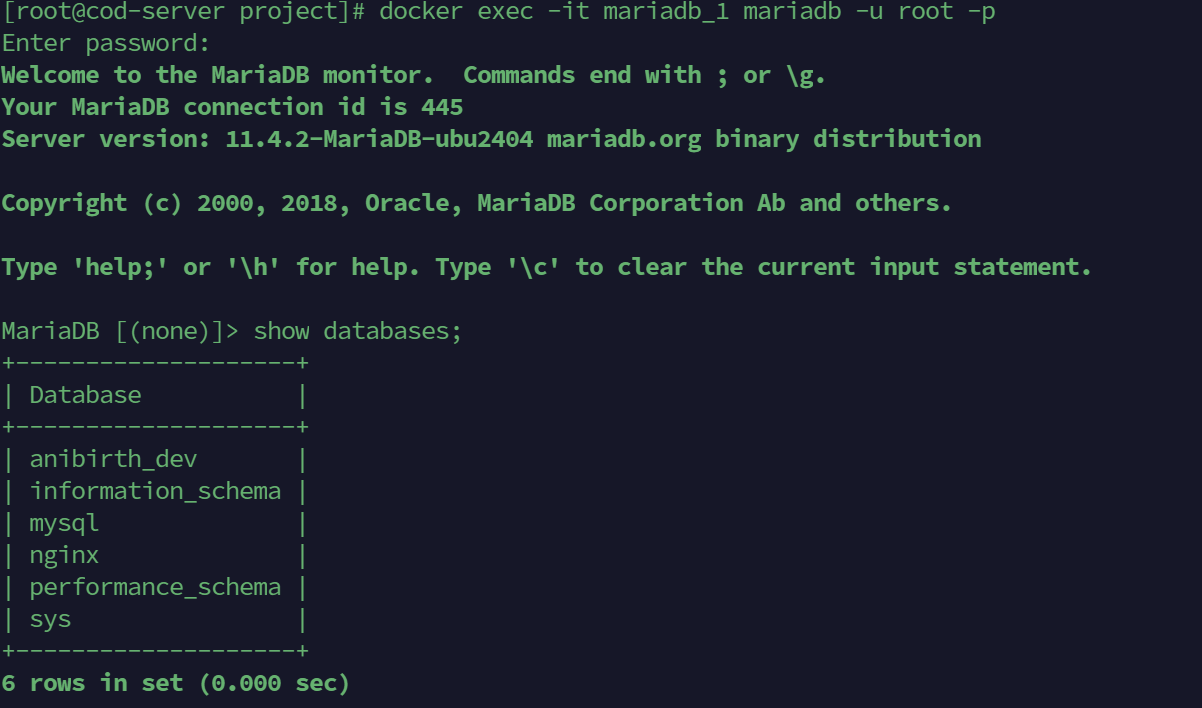 docker exec -it mariadb_1 mariadb -u root -p
