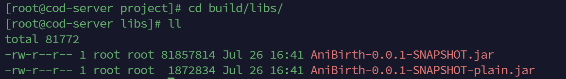 - ll을 통해 파일을 확인하고 가장 위에 있는 기본 SNAPSHOT.jar 파일명을 그래도 복사하여 명령어에 붙혀넣으면 된다.
