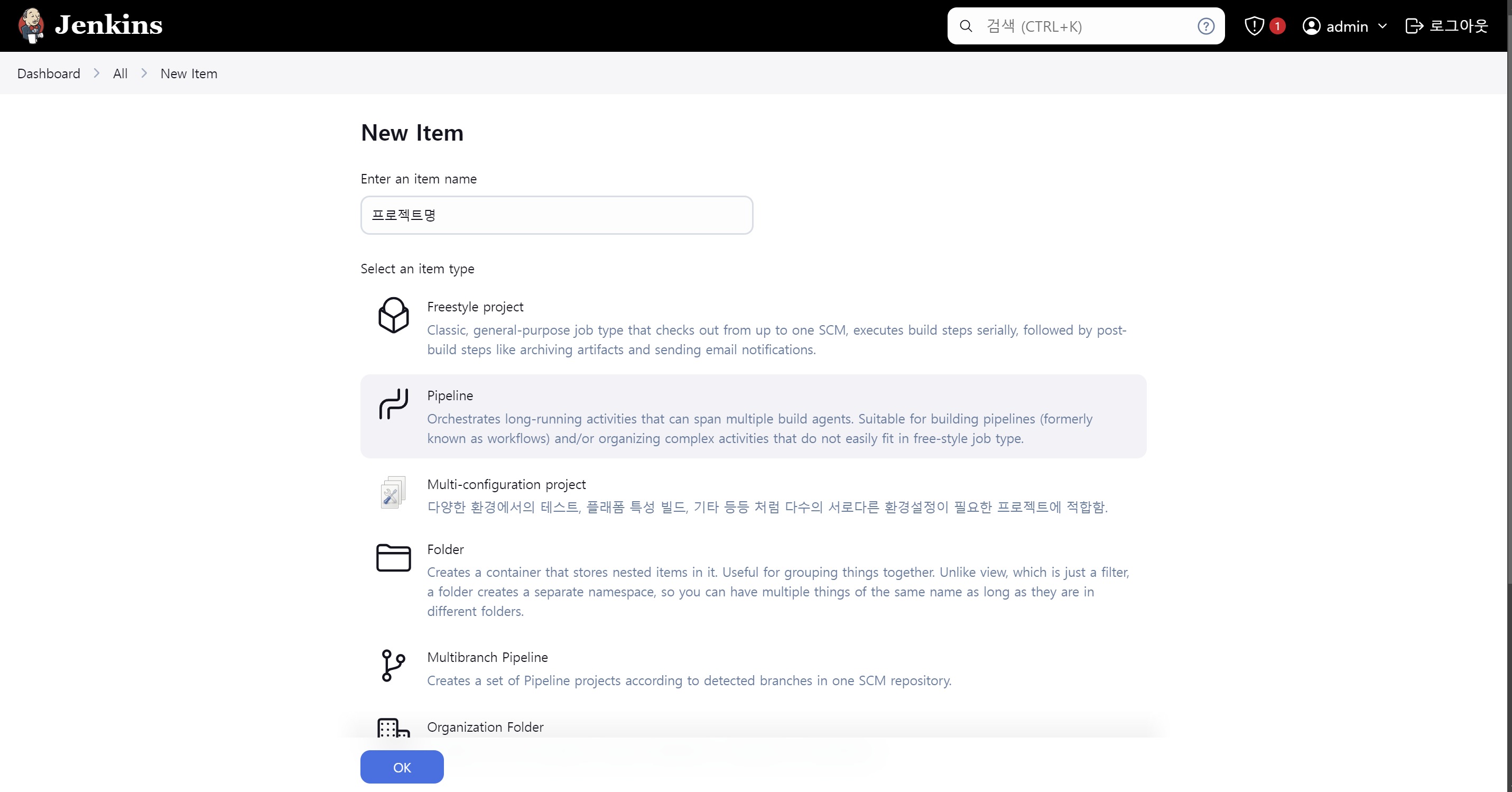 - 계정을 수정하면 메인 메뉴 좌측의 새로운 Item을 선택하여 아이템을 생성한다. 그리고 이 때 Item type은 pipeline을 선택해야한다.