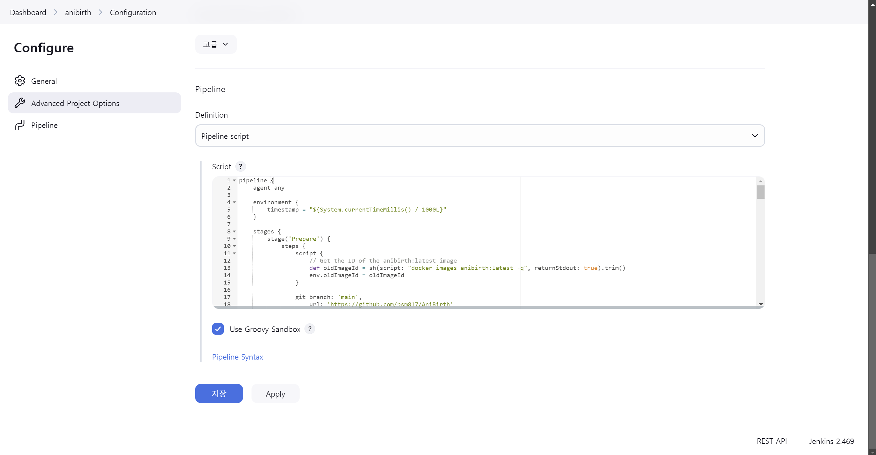 - 아래 사진과 같이 젠킨스에서 구성으로 들어가 파이프라인을 작성하면 되고, 파이프라인 내용도 함께 참고 부탁드립니다.