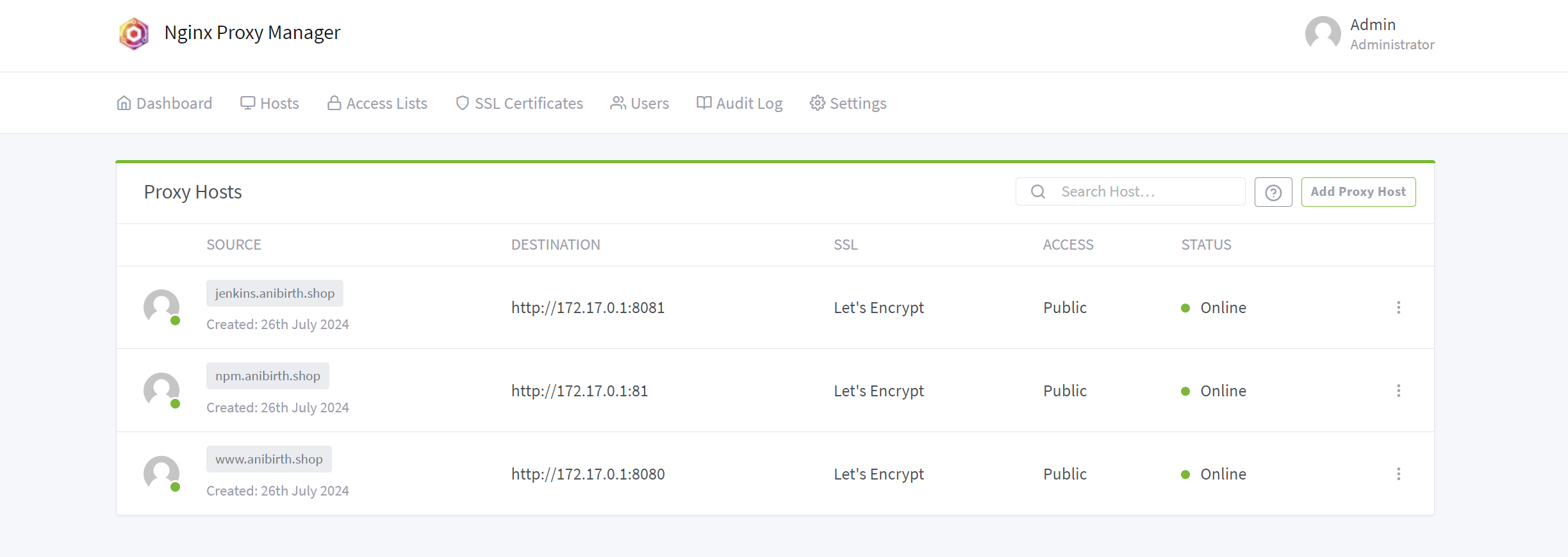 - 웹 사이트의 포트는 8080, npm의 포트는 81, 젠킨스의 포트는 8081로 추가를 해주고, 이렇게 설정을 하고 나면 기존의 보안이 떨어지는 http가 아니라 https로 접속이 가능하게 된다.