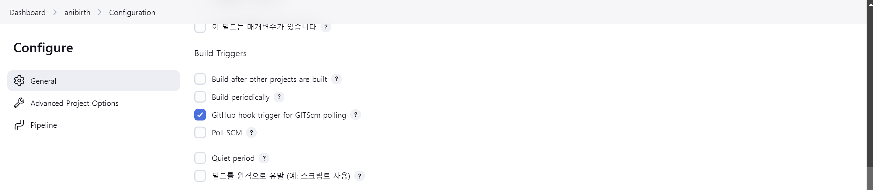 - 아래 사진과 같이 깃허브와 젠킨스에서 모두 웹훅에 의한 호출을 허용하도록 설정해야한다.