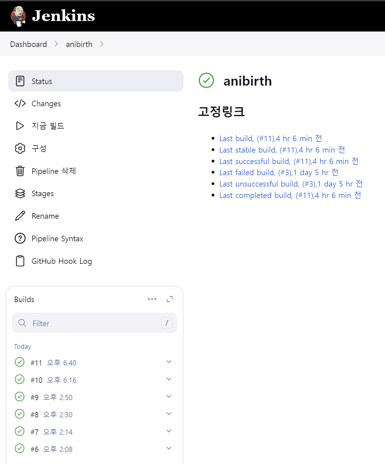 - 이렇게 파이프라인까지 작성됐다면, 실제로 배포중인 프로젝트에 main 브랜치에서 git push를 하게 되면 push와 동시에 jenkins에서 자동으로 빌드가 진행되고 배포가 진행된다.