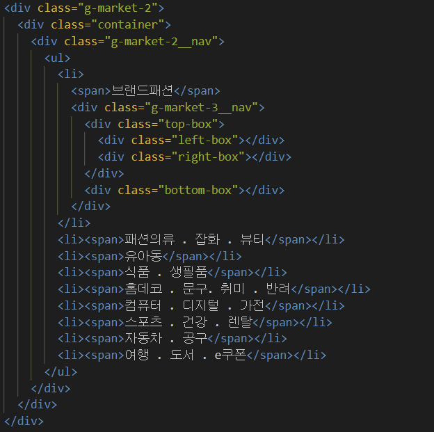 - 우선 g-market-2__nav > ul > li 아래에 3차 메뉴의 구조를 잡는 g-market-3__nav 태그를 생성한다.