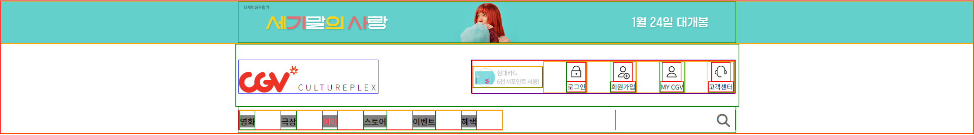 - CGV 홈페이지의 경우 상단 탑바 위에 팝업창이 있기 때문에 가장 최상단에 팝업 section을 두어 제작하였다.