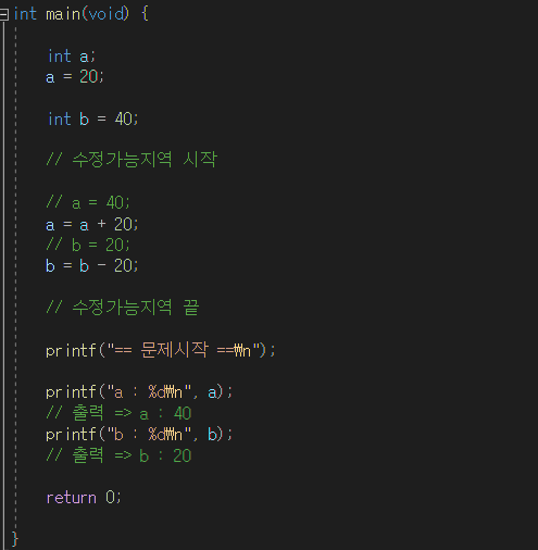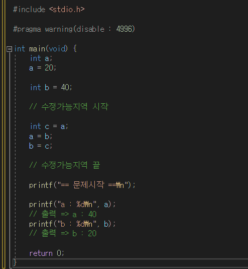 - 문제의 목적은 변수 a와 b의 값을 교체하는 것이고 결과적으로 a는 40, b는 20이 출력되어야 한다.