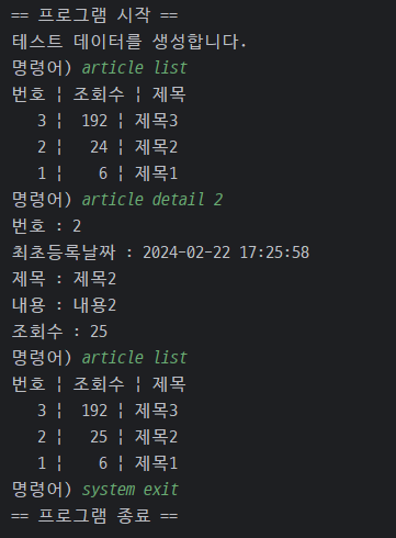 - makeTestData() 메서드에는 테스트 데이터를 생성한다는 출력문과 함께 전역변수인 articles에 각 게시물 정보를 add 해준다. 이 때 Article 객체 생성과 동시에 인작값으로 생성자 매개변수를 맞춰 테스트 데이터를 넣어준다.