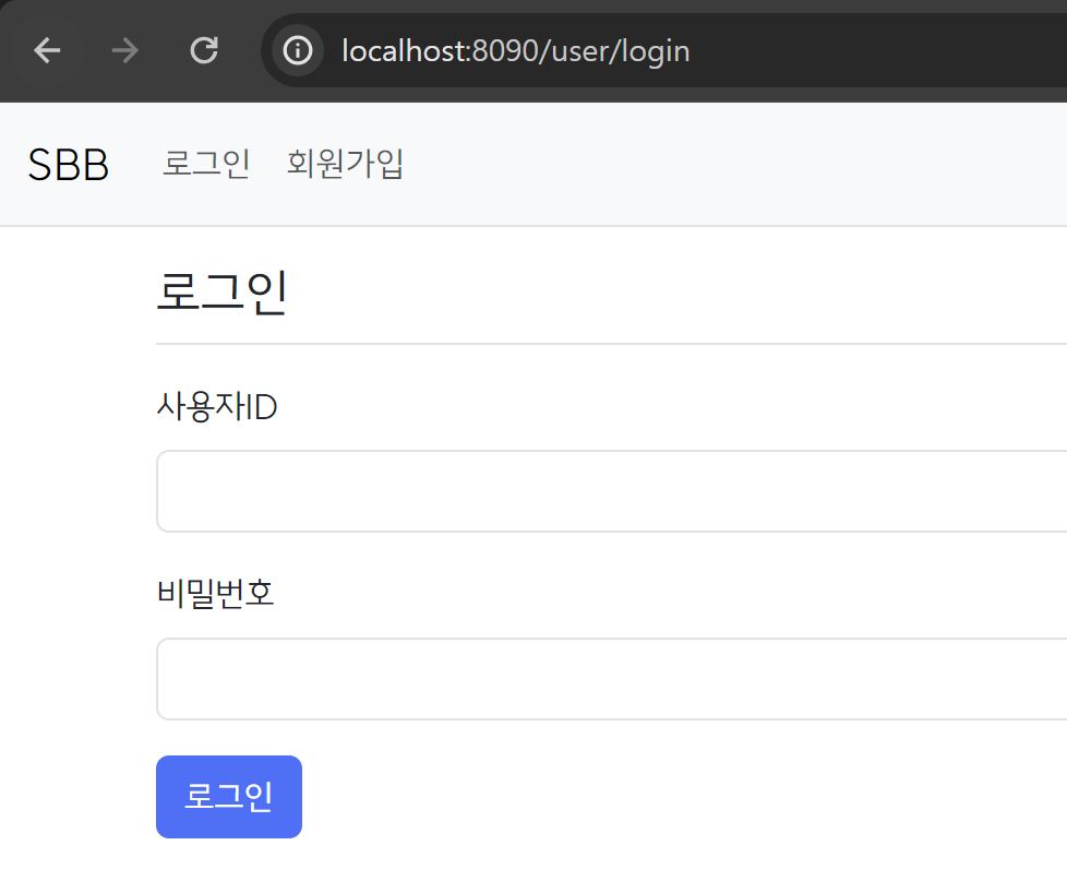 - 로그인 기능까지 구현이 완료되어 로그인 화면을 통해 이미 가입되어 있는 사용자 ID와 비밀번호를 입력했을 때, 로그인이 정상적으로 수행되고 메인 화면인 localhost:8090/question/list 페이지로 이동하게 된다.