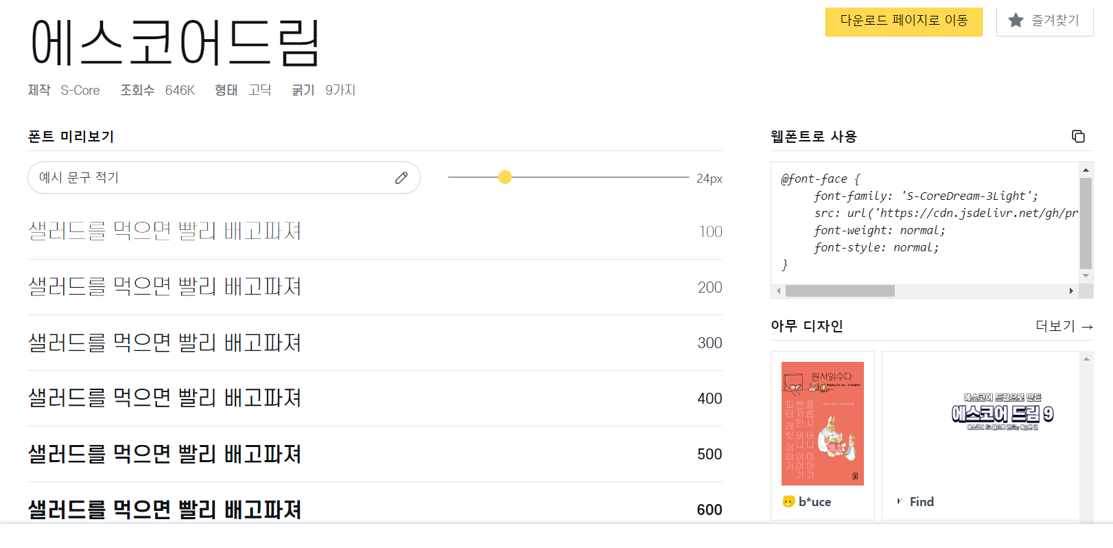 - 여기서 원하는 두께란 눈누에서 검색된 font의 폰트 미리보기를 통해 제시된 두께만 가능하다.